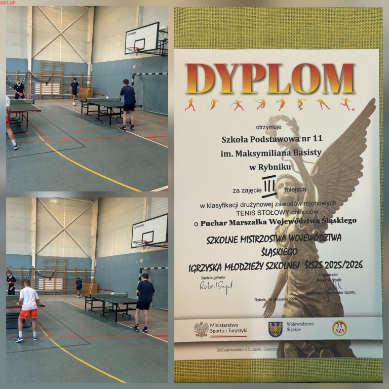 W dniu 19.11.2025 w SP24 Rybnik odbyły się zawody rejonowe w tenisie stołowym i naszą szkoła wywalczyla w tych zawodach 3 miejsce. GRATULUJEMY!