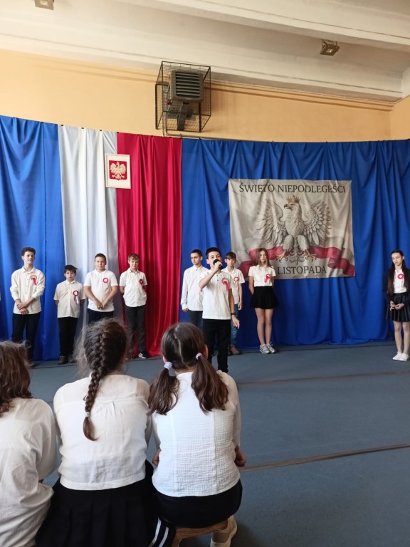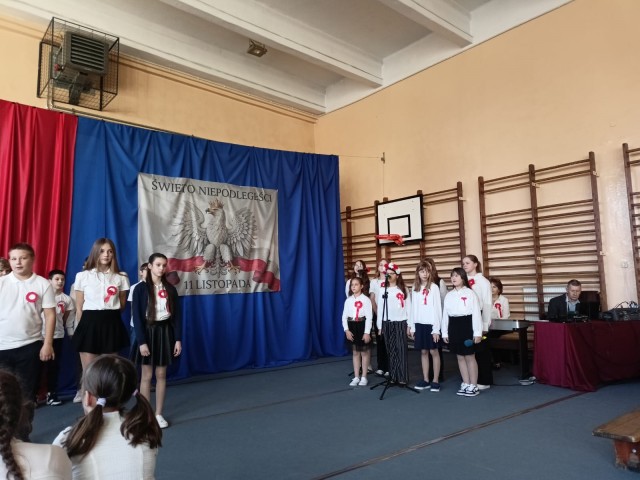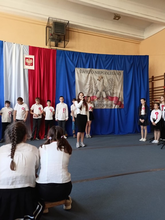 W miniony piątek społeczność szkolna uczestniczyła w uroczystej akademii z okazji Święta Niepodległości, przygotowanej przez klasę 6a. O godzinie 11:11 wszyscy uczniowie odśpiewali hymn państwowy, tym samym włączając się do ogólnopolskiej akcji "Szkoła do hymnu". Było podniośle i patriotycznie.