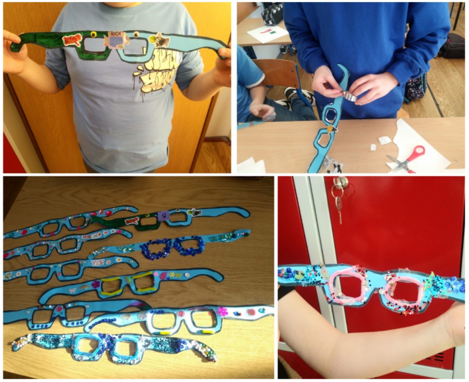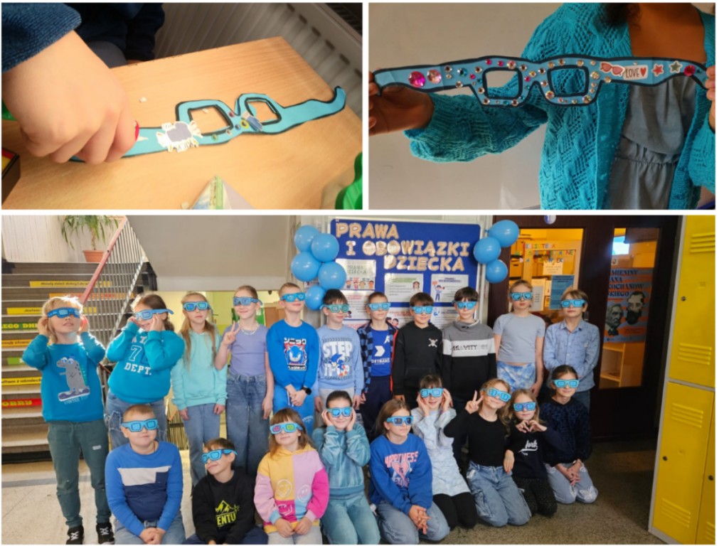 • Uczniowie klas młodszych wspólnie wykonali niebieskie okulary,