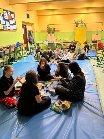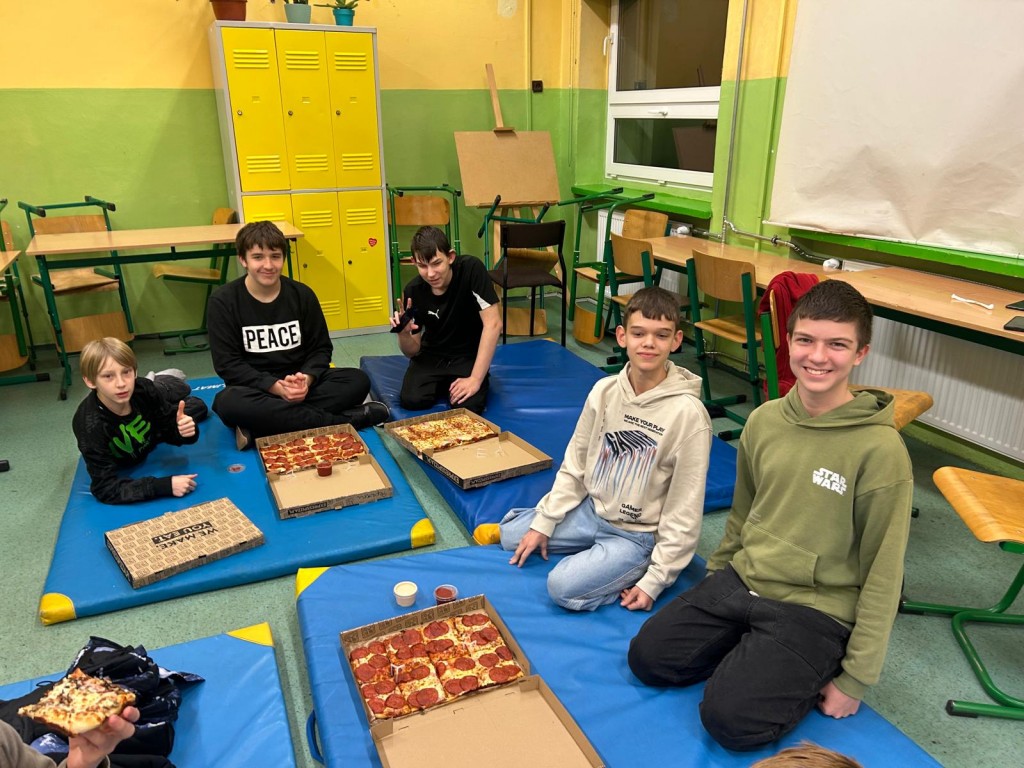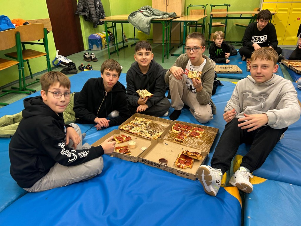5 grudnia w klasie 7a odbył się wyjątkowy mikołajkowy wieczorek, który wprowadził wszystkich w świąteczny nastrój. Uczniowie wspólnie spędzili czas, bawiąc się, rozmawiając i śmiejąc się do późnych godzin. Nie zabrakło też pysznej pizzy, która dodała energii do kolejnych atrakcji, a w sali panowała radosna atmosfera.