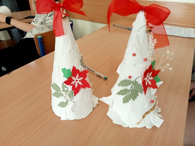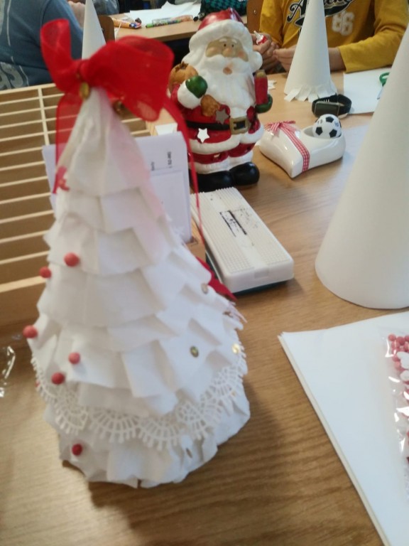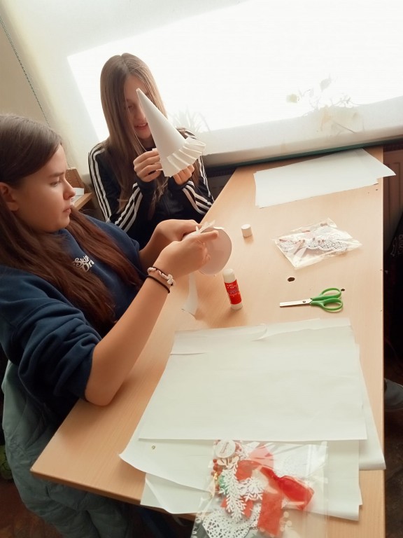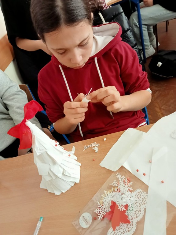 Klasa 6a również wzięła udział w świątecznych warsztatach kreatywnych. Zajęcia sprzyjały integracji i wymagały skupienia oraz precyzji wykonania. Ale było warto! Choinki posłużą za dekorację w domu lub w szkole.