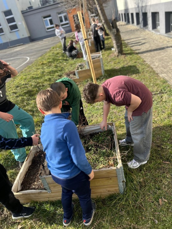 Podczas zajęć edukacji zdrowotnej uczniowie klas czwartych uporządkowali szkolny ogródek po zimie, usuwając suche liście i przygotowując grządki do nowych nasadzeń. Następnie wspólnie wysiali i posadzili wybrane rośliny warzywne oraz zioła.
